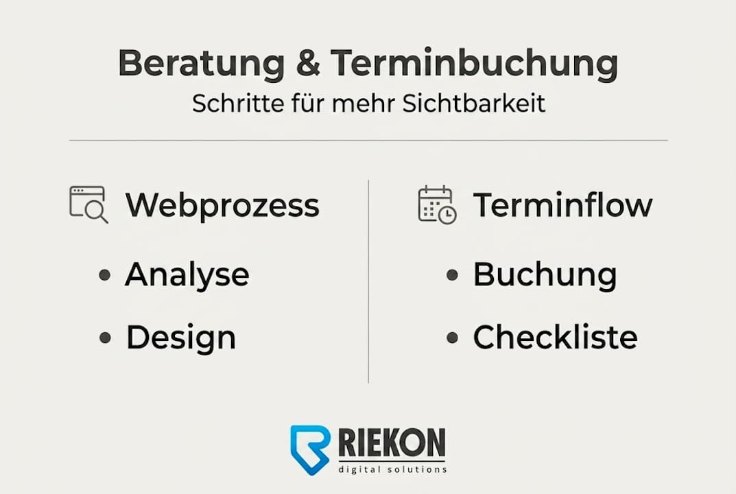 Bei Riekon begleiten wir Unternehmer, Praxen und Studios von der ersten Analyse bis zur laufenden Optimierung. Kein Fachjargon, keine versteckten Abhängigkeiten, sondern transparente Prozesse und Ergebnisse, die Sie selbst messen können. Unsere Leistungen für Webentwicklung umfassen alles von der Konzeption bis zur DSGVO-konformen Tool-Integration. Nehmen Sie jetzt Kontakt auf und erfahren Sie, wie Ihre Website in kurzer Zeit mehr Buchungen generieren kann.
