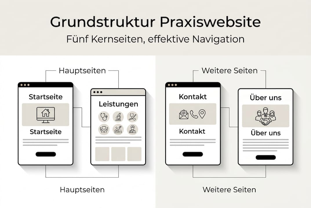 Startseite, Leistungen, Über uns, Kontakt und Datenschutz bilden das absolute Minimum. Die Startseite vermittelt den ersten Eindruck, Leistungen erklären Ihr Angebot, Über uns schafft Vertrauen, Kontakt ermöglicht Terminvereinbarungen und Datenschutz erfüllt rechtliche Anforderungen. Erweitern Sie später um FAQ oder Blog, wenn sinnvoll.